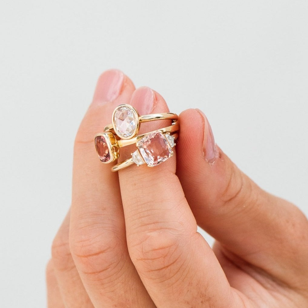 A specially-priced jewelry bundle featuring the most unique pink sapphire and diamond ring, plus a thick 5mm half round band to stack it with.