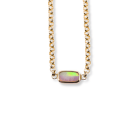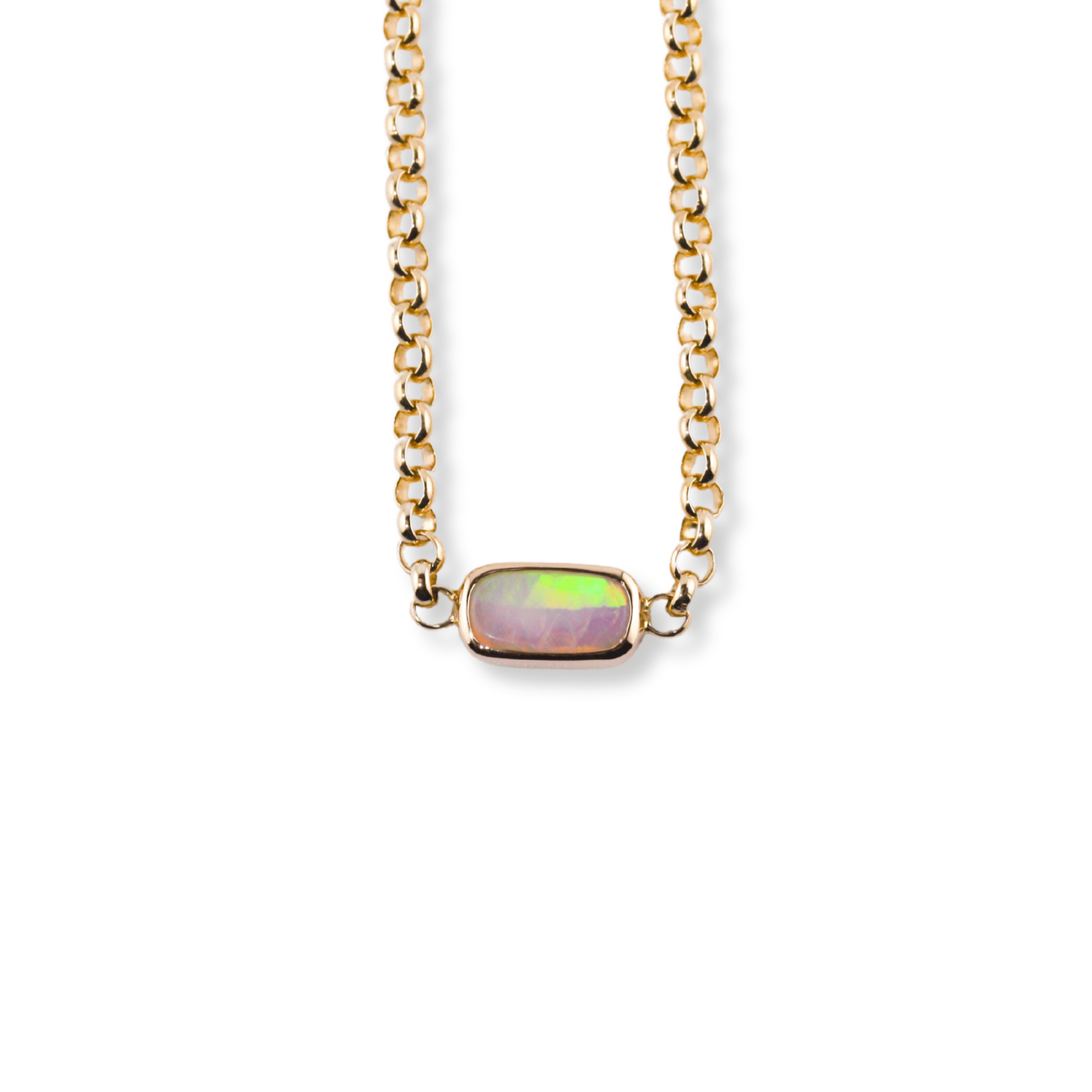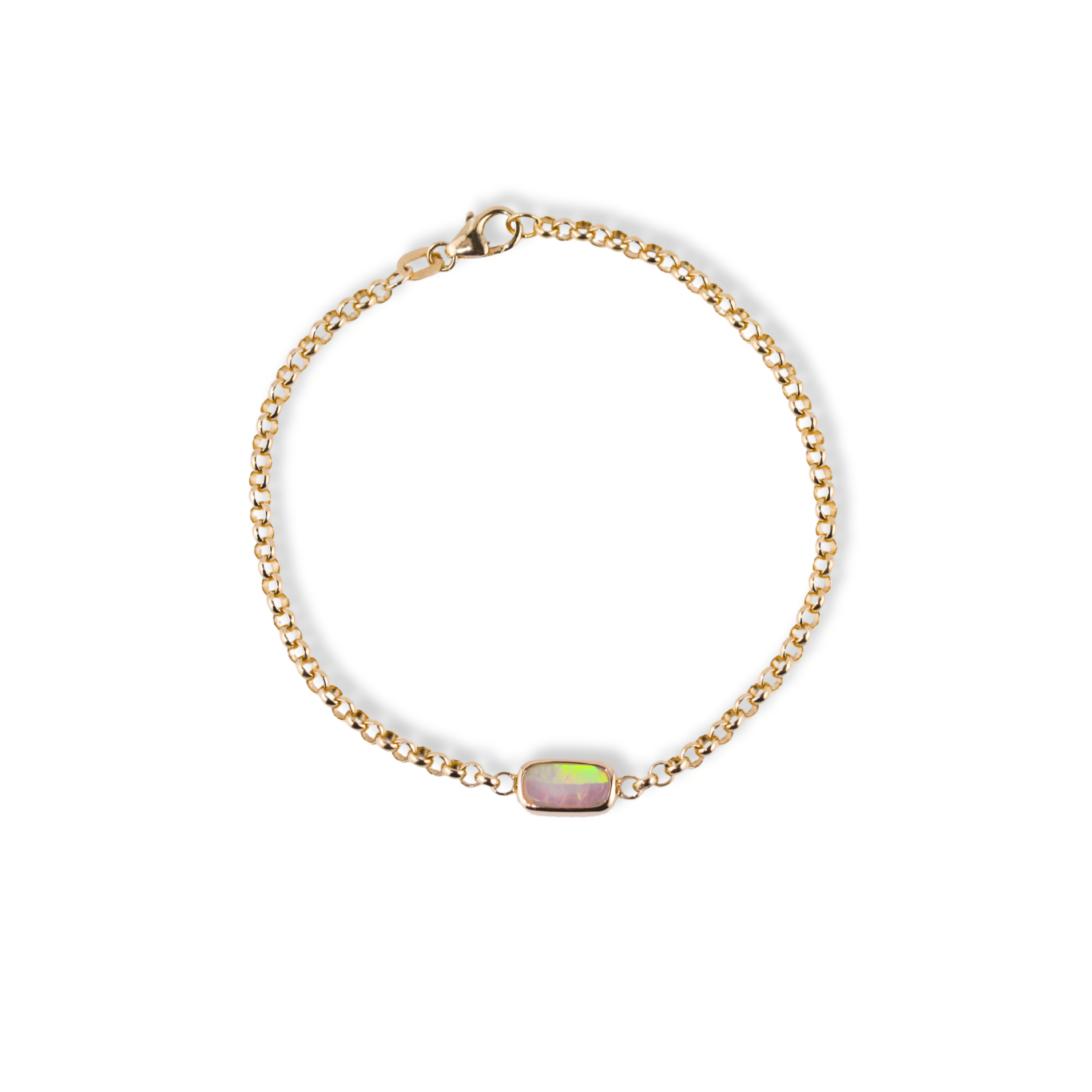 One-of-a-kind. This thick rolo-chain bracelet is studded with a gorgeous warm rainbowed opal, that’s bezel-set in recycled yellow gold. Named for a rainbow produced by moonlight rather than sunlight.