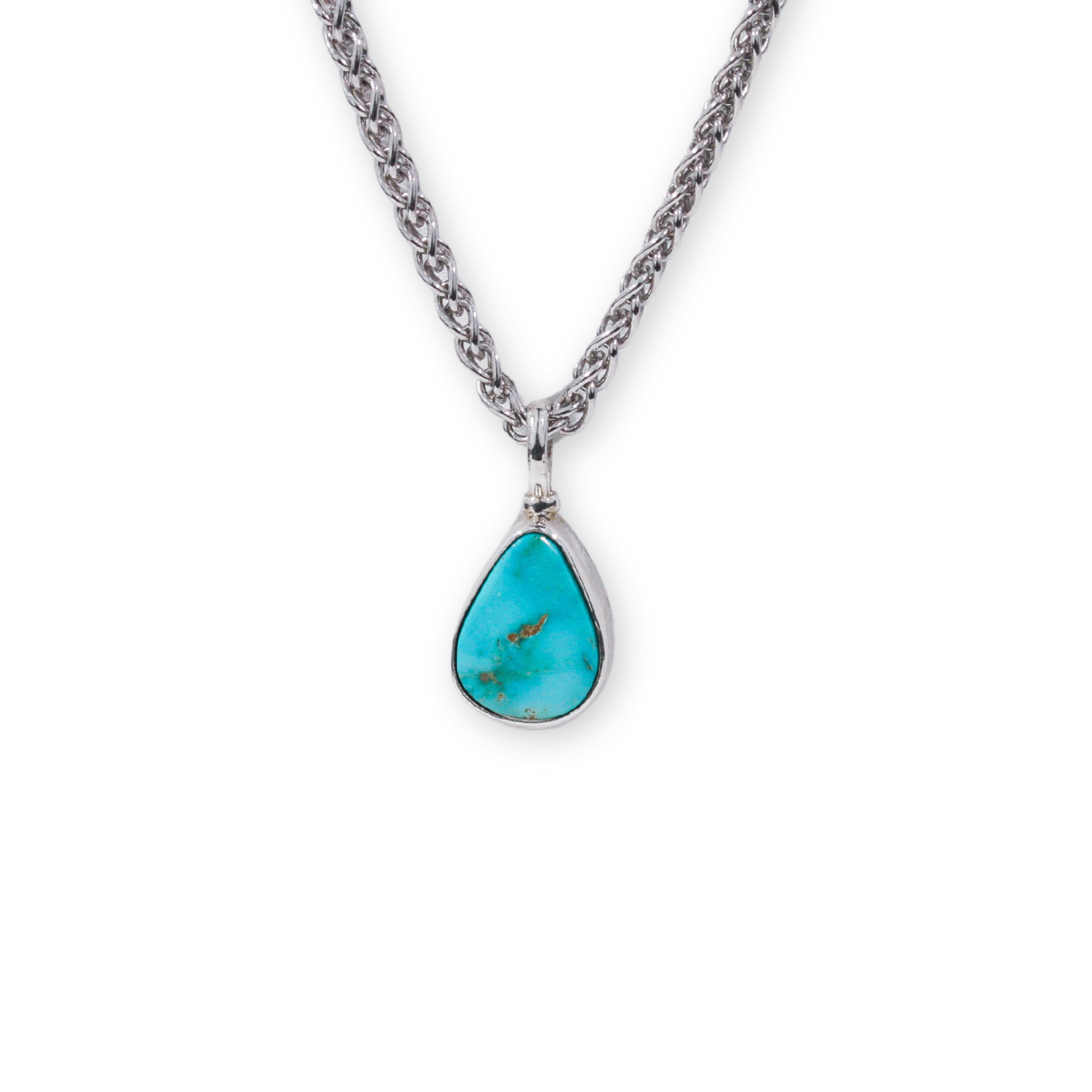 A teardrop-shaped piece of turquoise from Manassa, Colorado - with color and texture like no other, set in a chunky sterling silver bezel and hung from a thick rope-like spiga wheat chain. This necklace is one-of-a-kind, meaning there’s just one like it.