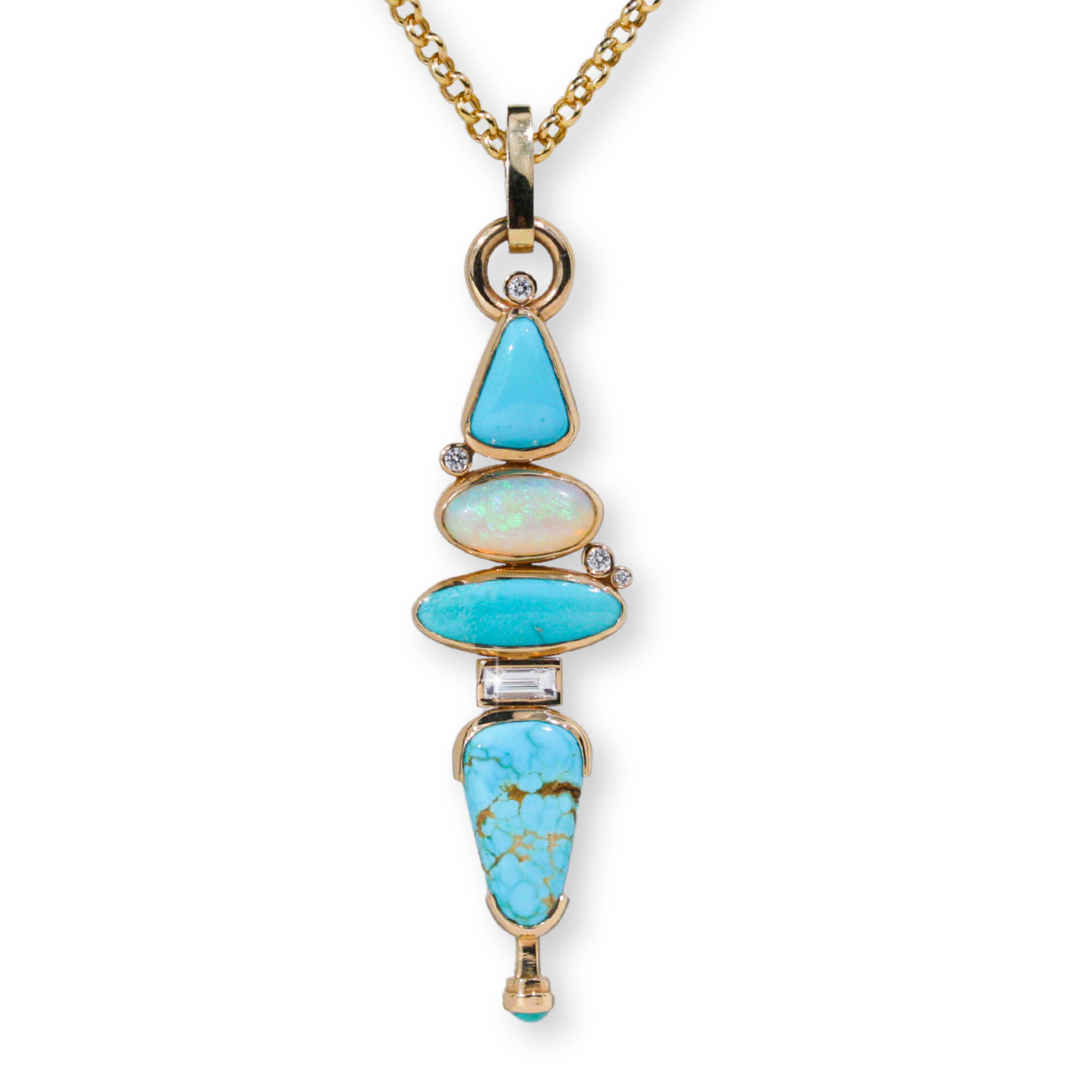 Totems are monuments that commemorate ancestry, histories, people, or events. Inspired by stacked rock formations that stretch into the turquoise blue Colorado sky, Sarah created these dramatic one-of-a-kind jewelry sculptures to mark important moments - in her own story as an artist, and in the story of the wearer.