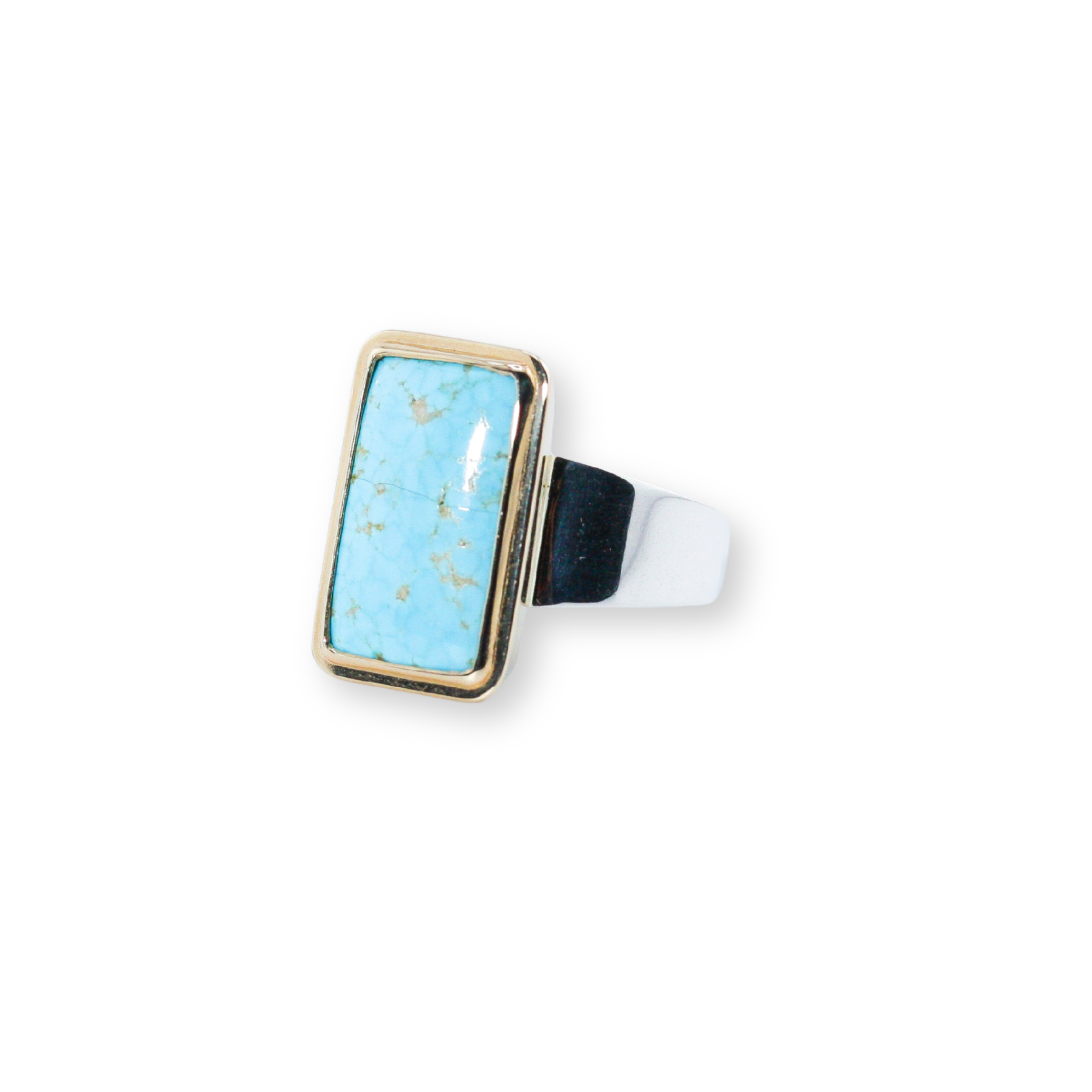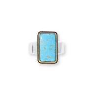 A long rectangular-shaped piece of turquoise from the Blue Gem Mine, set in a double yellow gold bezel frame. A stone like this elongates the finger in a gorgeously bold way.