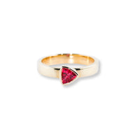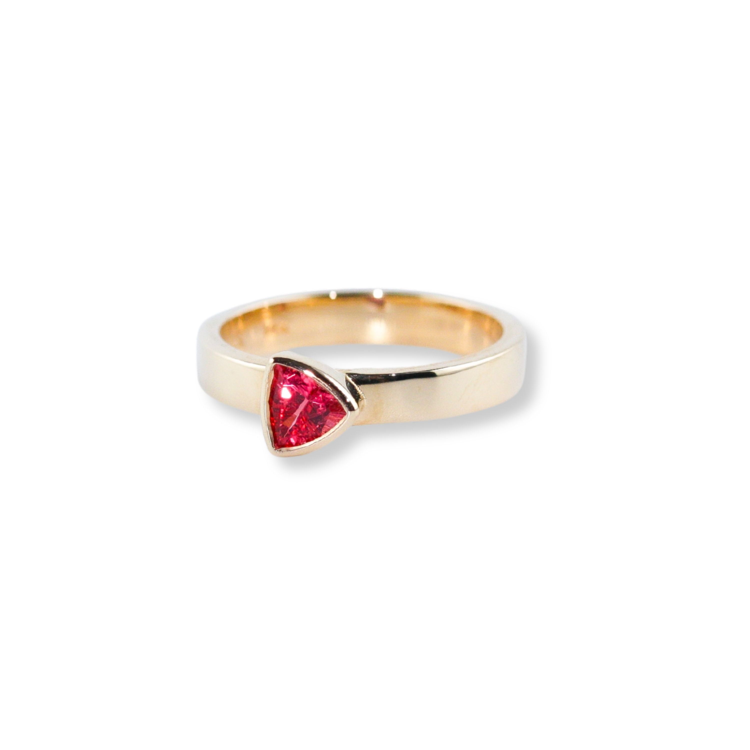 A vivid pinkish red spinel trillion gemstone, set east-west on a thick golden band. This particular color of spinel is rare and beautiful - reminiscent of beautiful red rock formations found in Sedona, Arizona.