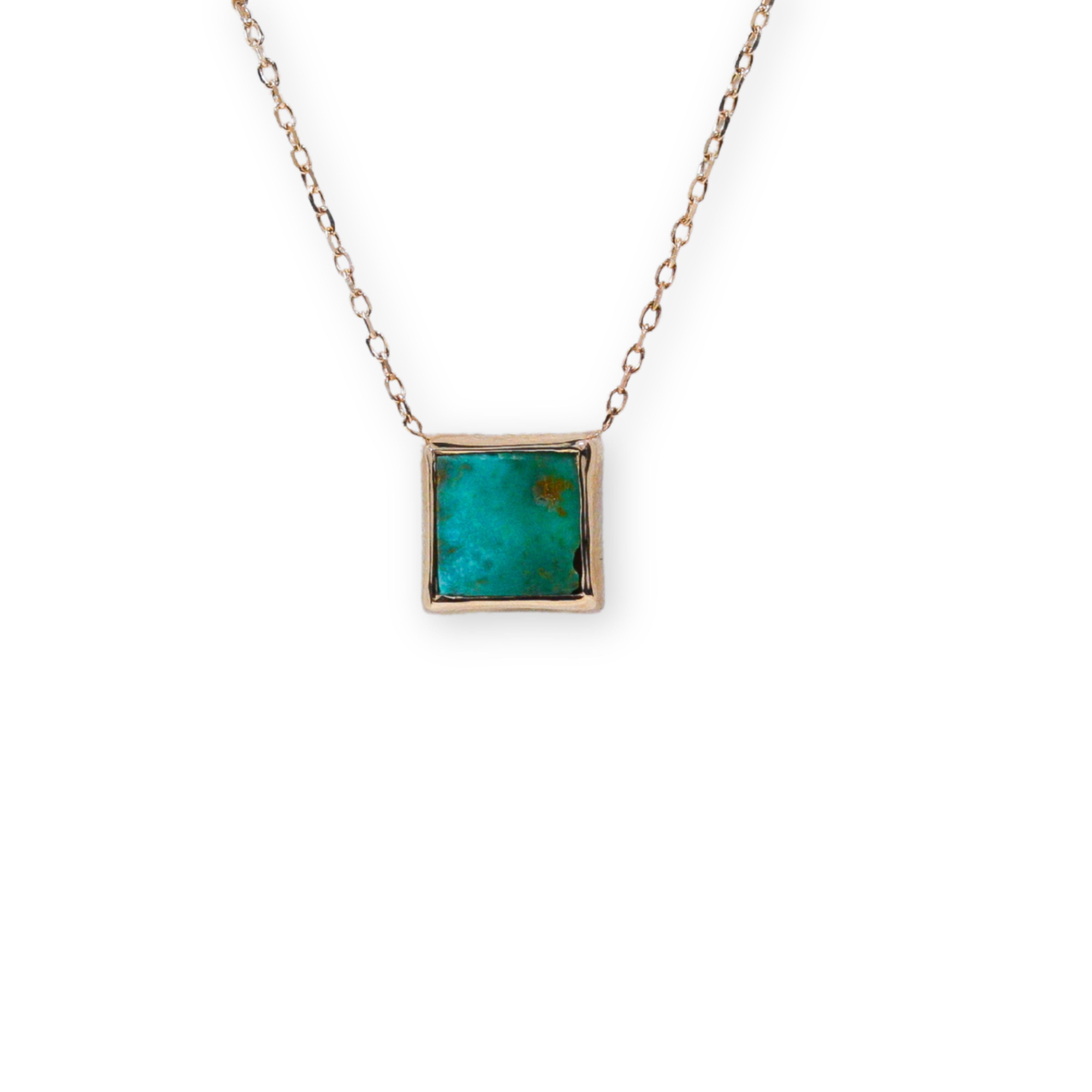 A spectacularly patterned piece of turquoise from Colorado that gives us feelings of a colorful western slope - with flecks of blue, green, and even rust. Set in a double thick yellow gold bezel on a delicate diamond-cut cable chain.