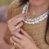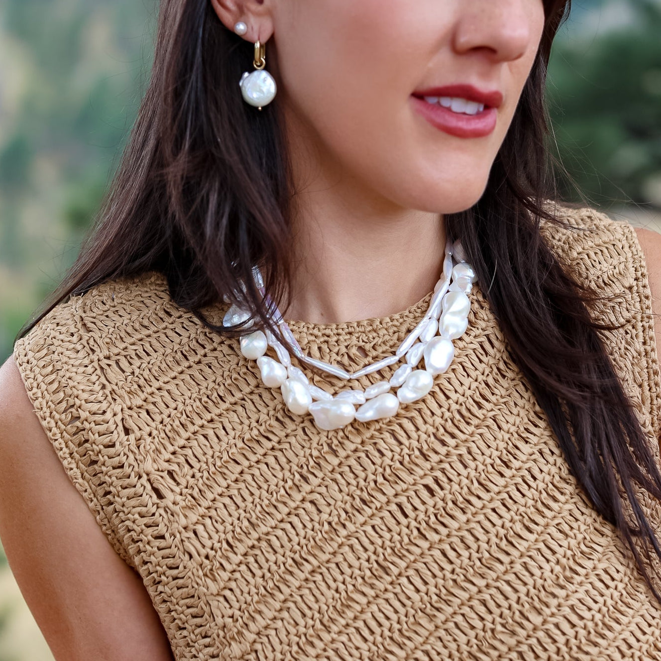 These over-the-top freshwater baroque pearls are piled onto a gorgeous necklace that makes a massive statement. The pearls are hand-knotted on silk and finished with a gold hook and catch clasp.