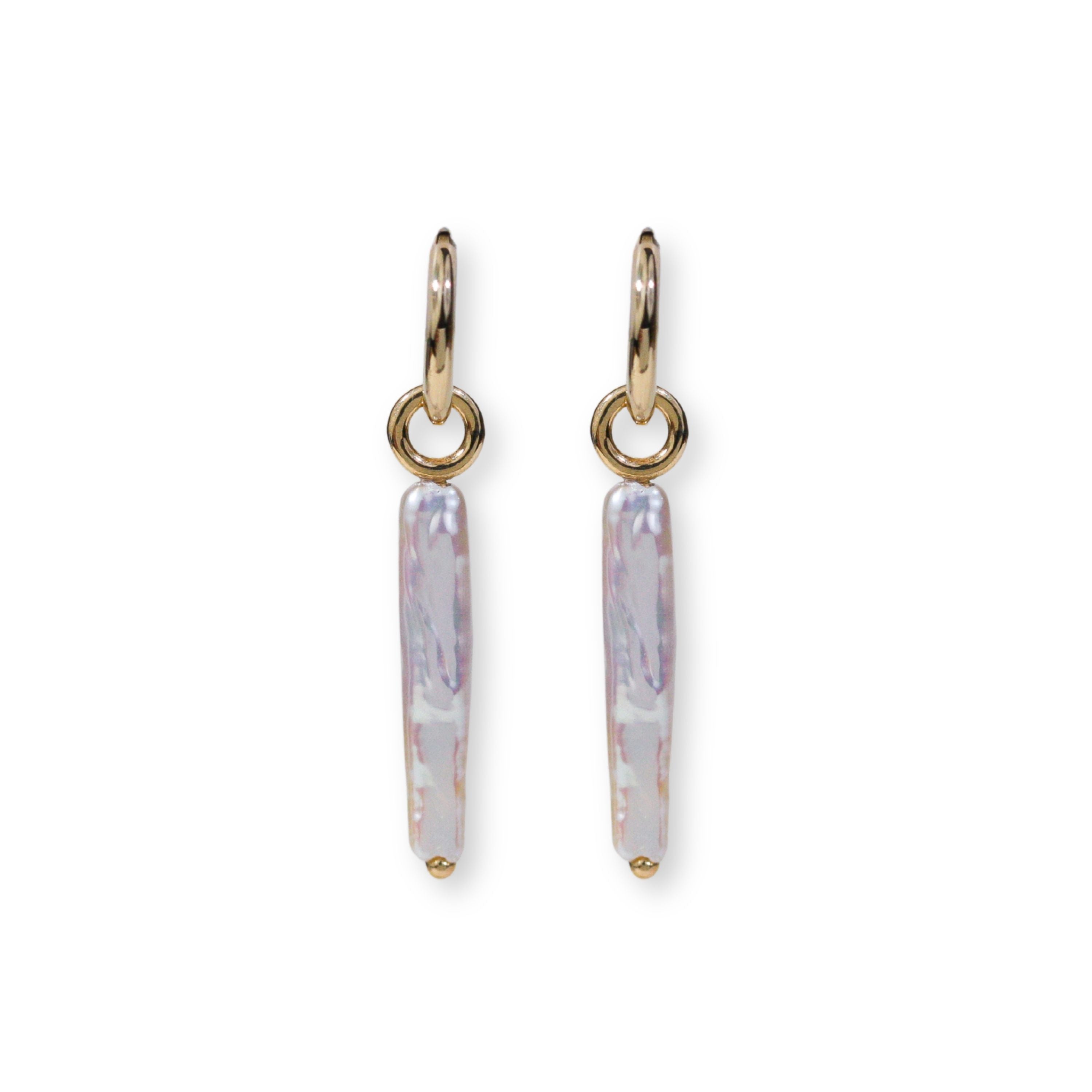 Two extra-long pearl charms accented with glimmering yellow gold. Each pearl was hand selected for its iridescence and uniqueness. We’ve never met a funky pearl we don’t love! Because the charms can be slid on and off of the hoops, you can opt to hang them from your favorite chain necklace or bracelet instead.