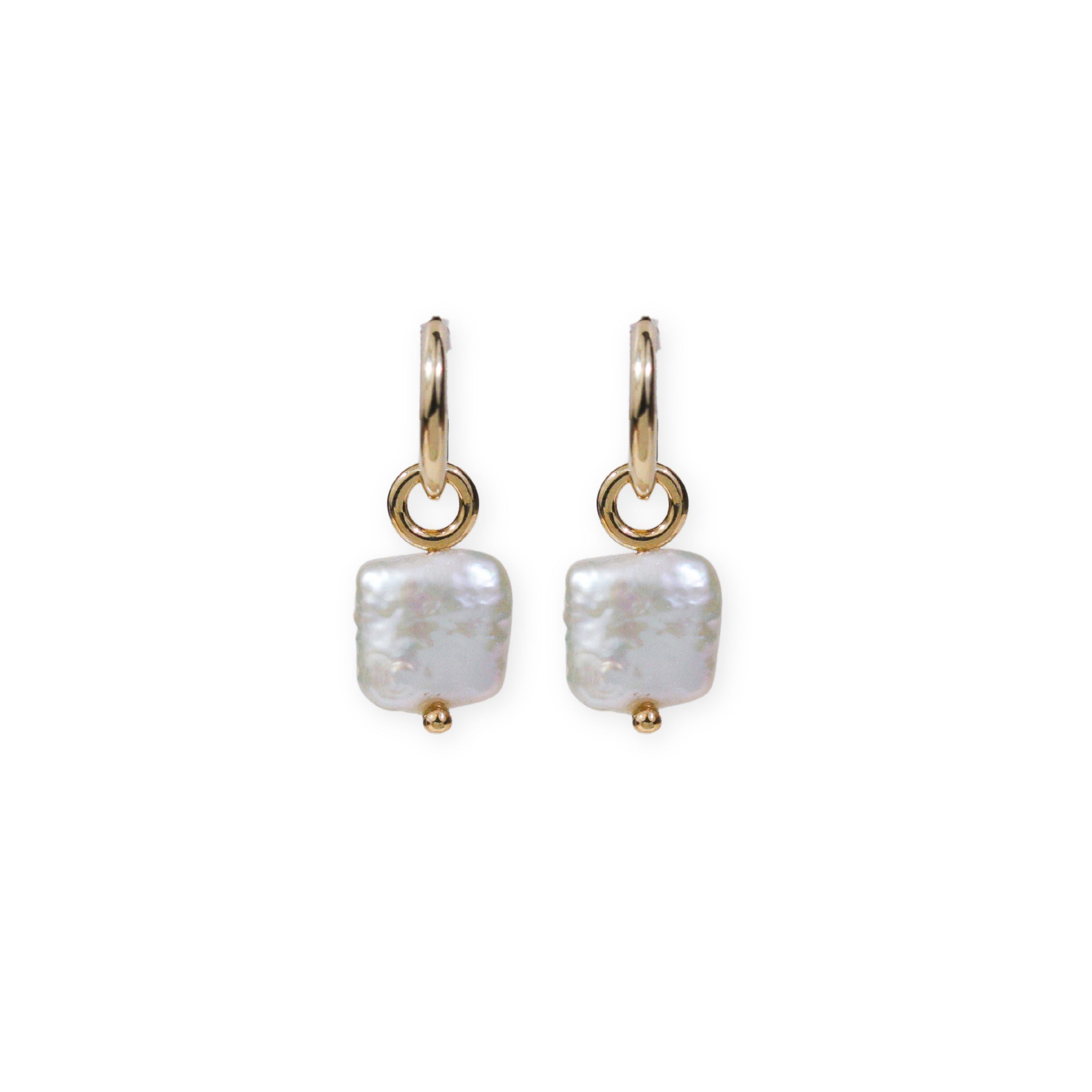 Two geometric pearl charms accented with glimmering yellow gold. Each pearl was hand selected for its iridescence and uniqueness. We’ve never met a funky pearl we don’t love! Because the charms can be slid on and off of the hoops, you can opt to hang them from your favorite chain necklace or bracelet instead.