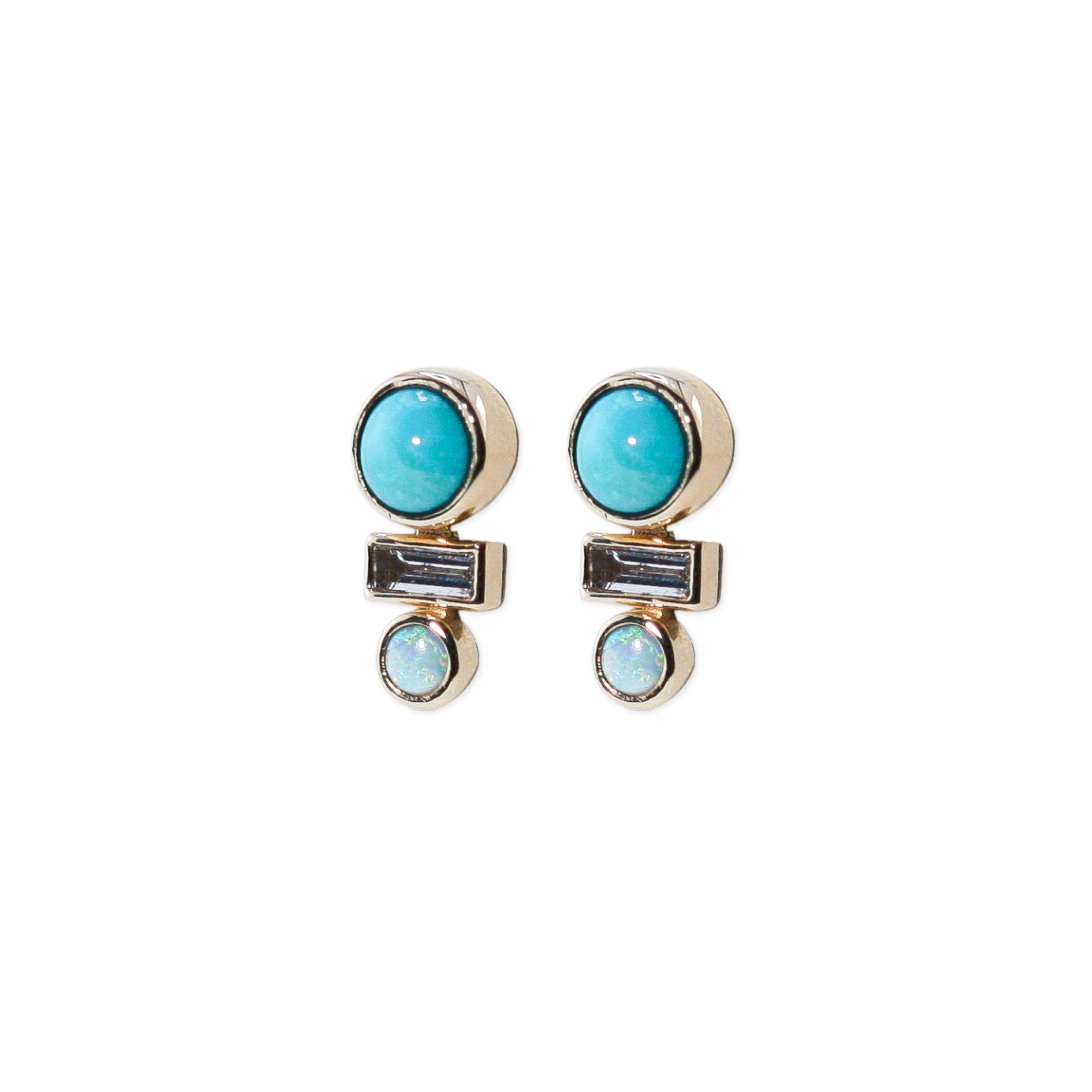 Totems are monuments that commemorate ancestry, histories, people, or events. Inspired by stacked rock formations that stretch into the turquoise blue Colorado sky, Sarah created these dramatic one-of-a-kind jewelry sculptures to mark important moments - in her own story as an artist, and in the story of the wearer. This small version designed for ears, features sparkling white diamonds, turquoise, and opal.